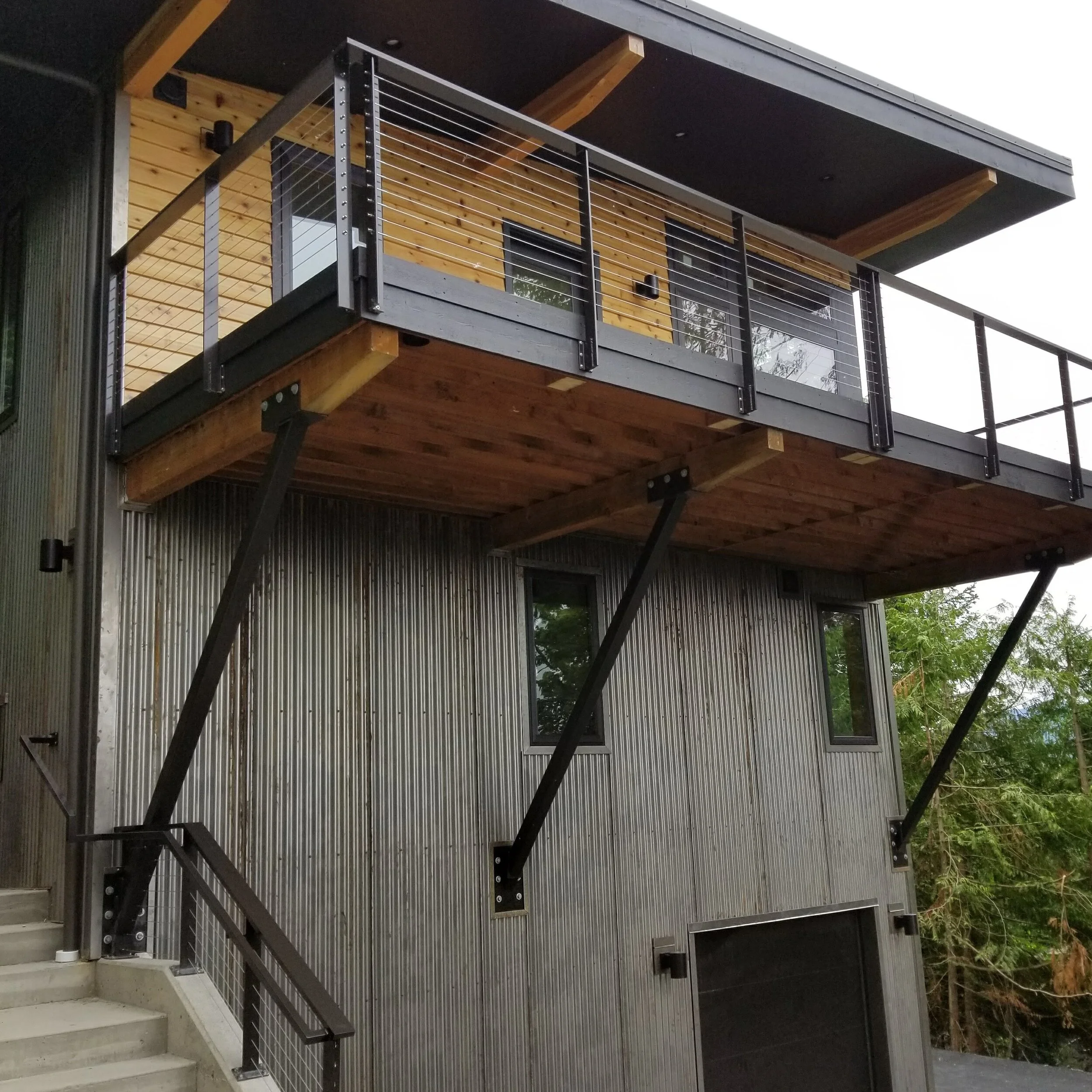 Custom deck supports to eliminate posts in the lower driveway of this modern three-story home in Bellingham.